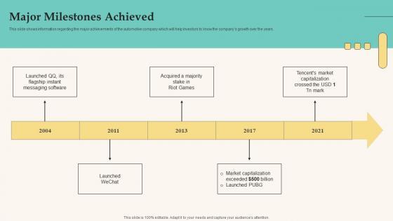 This slide shows information regarding the major achievements of the automotive company which will help investors to know the companys growth over the years. If your project calls for a presentation, then Slidegeeks is your go-to partner because we have professionally designed, easy-to-edit templates that are perfect for any presentation. After downloading, you can easily edit Major Milestones Achieved Elevator Pitch Deck For Funding Tech Company Introduction Pdf and make the changes accordingly. You can rearrange slides or fill them with different images. Check out all the handy templates This slide shows information regarding the major achievements of the automotive company which will help investors to know the companys growth over the years.