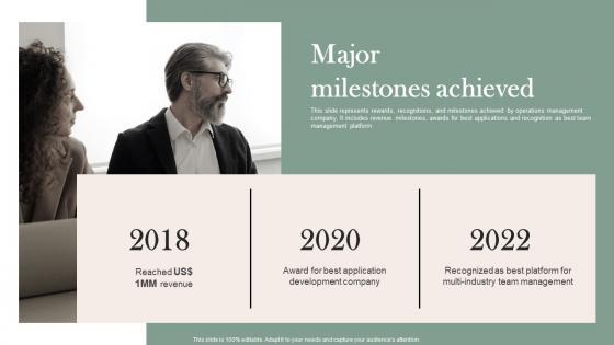 This slide represents rewards, recognitions, and milestones achieved by operations management company. It includes revenue milestones, awards for best applications and recognition as best team management platform. Slidegeeks has constructed Major Milestones Achieved Mobile Solution Company Investor Fund Raising Pitch Deck Information Pdf after conducting extensive research and examination. These presentation templates are constantly being generated and modified based on user preferences and critiques from editors. Here, you will find the most attractive templates for a range of purposes while taking into account ratings and remarks from users regarding the content. This is an excellent jumping off point to explore our content and will give new users an insight into our top notch PowerPoint Templates. This slide represents rewards, recognitions, and milestones achieved by operations management company. It includes revenue milestones, awards for best applications and recognition as best team management platform.