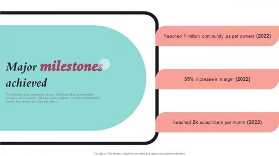 The following slide showcases various milestones that is achieved by company which provides pet care service platform to owners to help them identify and interact with ideal pet sitters. This Major Milestones Achieved Pet Care Company Investor Funding Elevator Pitch Deck Slide Pdf is perfect for any presentation, be it in front of clients or colleagues. It is a versatile and stylish solution for organizing your meetings. The Major Milestones Achieved Pet Care Company Investor Funding Elevator Pitch Deck Slide Pdf features a modern design for your presentation meetings. The adjustable and customizable slides provide unlimited possibilities for acing up your presentation. Slidegeeks has done all the homework before launching the product for you. So, do not wait, grab the presentation templates today The following slide showcases various milestones that is achieved by company which provides pet care service platform to owners to help them identify and interact with ideal pet sitters.