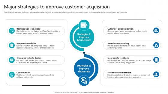This slide outlines major strategies implemented aimed at effectively acquiring and retaining existing customers. It covers strategies pertaining to improve bounce and churn rate Create an editable Major Strategies To Improve Customer Acquisition Product Analytics Implementation Data Analytics V that communicates your idea and engages your audience. Whether you are presenting a business or an educational presentation, pre-designed presentation templates help save time. Major Strategies To Improve Customer Acquisition Product Analytics Implementation Data Analytics V is highly customizable and very easy to edit, covering many different styles from creative to business presentations. Slidegeeks has creative team members who have crafted amazing templates. So, go and get them without any delay. This slide outlines major strategies implemented aimed at effectively acquiring and retaining existing customers. It covers strategies pertaining to improve bounce and churn rate