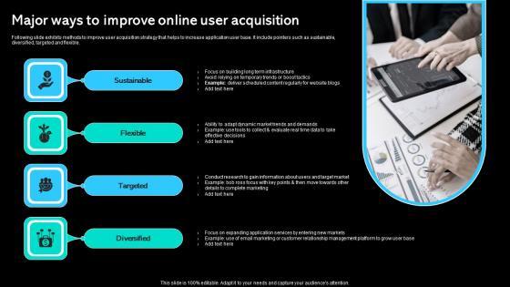 Following slide exhibits methods to improve user acquisition strategy that helps to increase application user base. It include pointers such as sustainable, diversified, targeted and flexible. Presenting this PowerPoint presentation, titled Major Ways To Improve Online User Acquisition Paid Marketing Approach Themes Pdf with topics curated by our researchers after extensive research. This editable presentation is available for immediate download and provides attractive features when used. Download now and captivate your audience. Presenting this Major Ways To Improve Online User Acquisition Paid Marketing Approach Themes Pdf Our researchers have carefully researched and created these slides with all aspects taken into consideration. This is a completely customizable Major Ways To Improve Online User Acquisition Paid Marketing Approach Themes Pdf that is available for immediate downloading. Download now and make an impact on your audience. Highlight the attractive features available with our PPTs. Following slide exhibits methods to improve user acquisition strategy that helps to increase application user base. It include pointers such as sustainable, diversified, targeted and flexible.