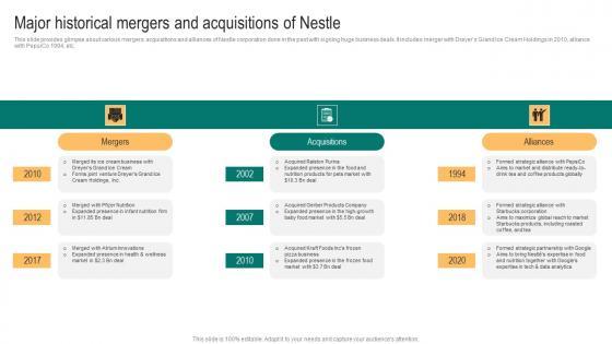 This slide provides glimpse about various mergers, acquisitions and alliances of Nestle corporation done in the past with signing huge business deals. It includes merger with Dreyers Grand Ice Cream Holdings in 2010, alliance with PepsiCo 1994, etc. Crafting an eye-catching presentation has never been more straightforward. Let your presentation shine with this tasteful yet straightforward Nestle Performance Management Report Major Historical Mergers And Acquisitions Icons PDF template. It offers a minimalistic and classy look that is great for making a statement. The colors have been employed intelligently to add a bit of playfulness while still remaining professional. Construct the ideal Nestle Performance Management Report Major Historical Mergers And Acquisitions Icons PDF that effortlessly grabs the attention of your audience Begin now and be certain to wow your customers.
