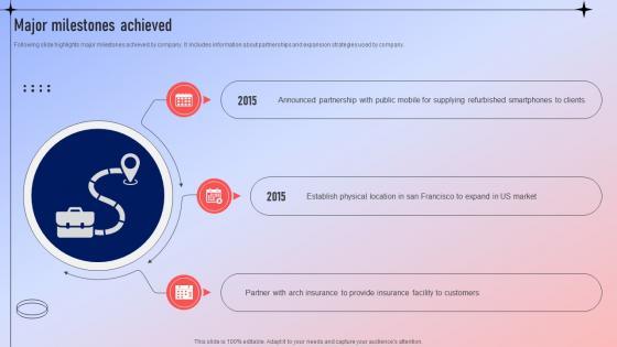 Following slide highlights major milestones achieved by company. It includes information about partnerships and expansion strategies used by company. If your project calls for a presentation, then Slidegeeks is your go-to partner because we have professionally designed, easy-to-edit templates that are perfect for any presentation. After downloading, you can easily edit Major Milestones Achieved Fundraising Pitch Deck For Ecommerce Platform and make the changes accordingly. You can rearrange slides or fill them with different images. Check out all the handy templates Following slide highlights major milestones achieved by company. It includes information about partnerships and expansion strategies used by company.