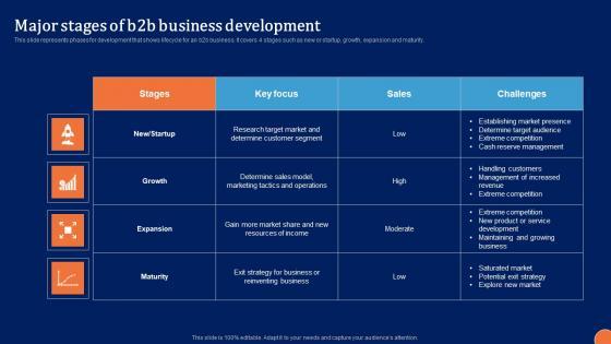 This slide represents phases for development that shows lifecycle for an b2b business. It covers 4 stages such as new or startup, growth, expansion and maturity. This Major Stages Of B2B Business Digital Platform Administration For B2B Ecommerce Introduction Pdf from Slidegeeks makes it easy to present information on your topic with precision. It provides customization options, so you can make changes to the colors, design, graphics, or any other component to create a unique layout. It is also available for immediate download, so you can begin using it right away. Slidegeeks has done good research to ensure that you have everything you need to make your presentation stand out. Make a name out there for a brilliant performance. This slide represents phases for development that shows lifecycle for an b2b business. It covers 4 stages such as new or startup, growth, expansion and maturity.