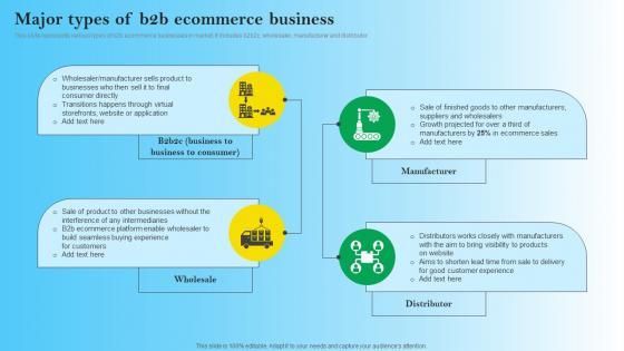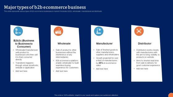 This slide represents various types of b2b ecommerce businesses in market. It includes b2b2c, wholesaler, manufacturer and distributor.Slidegeeks has constructed Major Types Of B2b Ecommerce Business Comprehensive Guide For Developing Brochure PDF after conducting extensive research and examination. These presentation templates are constantly being generated and modified based on user preferences and critiques from editors. Here, you will find the most attractive templates for a range of purposes while taking into account ratings and remarks from users regarding the content. This is an excellent jumping-off point to explore our content and will give new users an insight into our top-notch PowerPoint Templates.