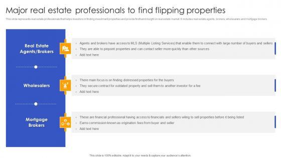 This slide represents real estate professionals that helps investors in finding investment properties and provide firsthand insight on real estate market. It includes real estate agents, brokers, wholesalers and mortgage brokers. There are so many reasons you need a Deploying House Flipping Busi. The first reason is you can not spend time making everything from scratch, Thus, Slidegeeks has made presentation templates for you too. You can easily download these templates from our website easily.