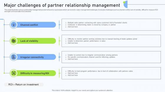 This slide illustrates various partnership management problems faced by businesses which can be led to sales management challenges. It includes challenges such as channel conflict, lack of visibility, difficult to measure ROI and right communication tool selection. Welcome to our selection of the Relationship Management Automation Major Challenges Of Partner Relationship Management. These are designed to help you showcase your creativity and bring your sphere to life. Planning and Innovation are essential for any business that is just starting out. This collection contains the designs that you need for your everyday presentations. All of our PowerPoints are 100Percent editable, so you can customize them to suit your needs. This multi-purpose template can be used in various situations. Grab these presentation templates today. This slide illustrates various partnership management problems faced by businesses which can be led to sales management challenges. It includes challenges such as channel conflict, lack of visibility, difficult to measure ROI and right communication tool selection.