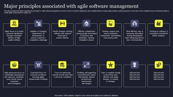 This slide provides information regarding key principles of Agile software management in terms of focus on customer satisfaction with consistent delivery of high-quality software, optimizing amount of work done, offer consistent focus on technical excellence enable agility enhancement to design, etc. Find highly impressive Major Principles Associated With Agile Software Management Playbook For Managing Us Icons Pdf on Slidegeeks to deliver a meaningful presentation. You can save an ample amount of time using these presentation templates. No need to worry to prepare everything from scratch because Slidegeeks experts have already done a huge research and work for you. You need to download Major Principles Associated With Agile Software Management Playbook For Managing Us Icons Pdf for your upcoming presentation. All the presentation templates are 100Precent editable and you can change the color and personalize the content accordingly. Download now. This slide provides information regarding key principles of Agile software management in terms of focus on customer satisfaction with consistent delivery of highquality software, optimizing amount of work done, offer consistent focus on technical excellence enable agility enhancement to design, etc.