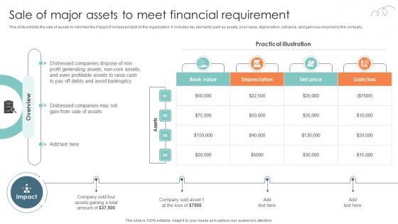 This slide exhibits the sale of assets to minimize the impact of increased debt on the organization. It includes key elements such as assets, book value, depreciation, sell price, and gain loss incurred by the company. Presenting this PowerPoint presentation, titled Strategies For Stabilizing Corporate Sale Of Major Assets To Meet Financial Requirement, with topics curated by our researchers after extensive research. This editable presentation is available for immediate download and provides attractive features when used. Download now and captivate your audience. Presenting this Strategies For Stabilizing Corporate Sale Of Major Assets To Meet Financial Requirement. Our researchers have carefully researched and created these slides with all aspects taken into consideration. This is a completely customizable Strategies For Stabilizing Corporate Sale Of Major Assets To Meet Financial Requirement that is available for immediate downloading. Download now and make an impact on your audience. Highlight the attractive features available with our PPTs. This slide exhibits the sale of assets to minimize the impact of increased debt on the organization. It includes key elements such as assets, book value, depreciation, sell price, and gain loss incurred by the company.