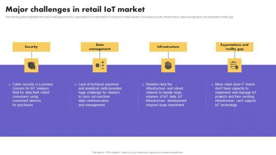The following slide highlights the major challenges faced by organizations to implement IoT solutions in retail industry. It includes security, infrastructure, data management, and expectation reality gap Welcome to our selection of the Major Challenges In Retail How Industrial IoT Is Changing Worldwide Slides Pdf. These are designed to help you showcase your creativity and bring your sphere to life. Planning and Innovation are essential for any business that is just starting out. This collection contains the designs that you need for your everyday presentations. All of our PowerPoints are 100 percent editable, so you can customize them to suit your needs. This multi purpose template can be used in various situations. Grab these presentation templates today The following slide highlights the major challenges faced by organizations to implement IoT solutions in retail industry. It includes security, infrastructure, data management, and expectation reality gap