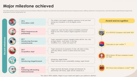 This slide mentions various products and services features offered by Target to its customers. Key products and services includes groceries, clothing, electronics, home good, toys, sport and outdoor, target Redcard, target circle, target guest services, target optical, etc. If you are looking for a format to display your unique thoughts, then the professionally designed Major Milestone Achieved Retail Store Investor Elevator Pitch Deck is the one for you. You can use it as a Google Slides template or a PowerPoint template. Incorporate impressive visuals, symbols, images, and other charts. Modify or reorganize the text boxes as you desire. Experiment with shade schemes and font pairings. Alter, share or cooperate with other people on your work. Download Major Milestone Achieved Retail Store Investor Elevator Pitch Deck and find out how to give a successful presentation. Present a perfect display to your team and make your presentation unforgettable. This slide mentions various products and services features offered by Target to its customers. Key products and services includes groceries, clothing, electronics, home good, toys, sport and outdoor, target Redcard, target circle, target guest services, target optical, etc.