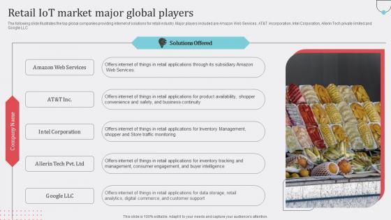 The following slide Illustrates the top global companies providing internet of solutions for retail industry. Major players included are Amazon Web Services, ATandT incorporation, Intel Corporation, Allerin Tech private limited and Google LLC There are so many reasons you need a Retail IoT Market Major Global How Industrial IoT Is Changing Worldwide Topics Pdf. The first reason is you can not spend time making everything from scratch, Thus, Slidegeeks has made presentation templates for you too. You can easily download these templates from our website easily. The following slide Illustrates the top global companies providing internet of solutions for retail industry. Major players included are Amazon Web Services, ATandT incorporation, Intel Corporation, Allerin Tech private limited and Google LLC