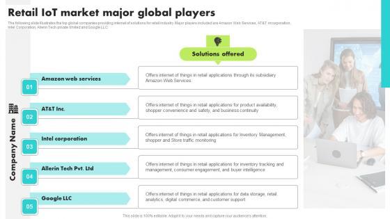 The following slide Illustrates the top global companies providing internet of solutions for retail industry. Major players included are Amazon Web Services, ATandT incorporation, Intel Corporation, Allerin Tech private limited and Google LLC Take your projects to the next level with our ultimate collection of Retail IoT Market Major Global Players Guide For Retail IoT Solutions Analysis Professional Pdf. Slidegeeks has designed a range of layouts that are perfect for representing task or activity duration, keeping track of all your deadlines at a glance. Tailor these designs to your exact needs and give them a truly corporate look with your own brand colors they will make your projects stand out from the rest The following slide Illustrates the top global companies providing internet of solutions for retail industry. Major players included are Amazon Web Services, ATandT incorporation, Intel Corporation, Allerin Tech private limited and Google LLC