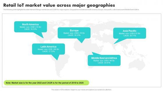 The following slide highlights the retail internet of things market size and CAGR for major regions. Geographies included are North America, Europe, Asia pacific, Latin America and Middle East and Africa. There are so many reasons you need a . The first reason is you can not spend time making everything from scratch, Thus, Slidegeeks has made presentation templates for you too. You can easily download these templates from our website easily. The following slide highlights the retail internet of things market size and CAGR for major regions. Geographies included are North America, Europe, Asia pacific, Latin America and Middle East and Africa.