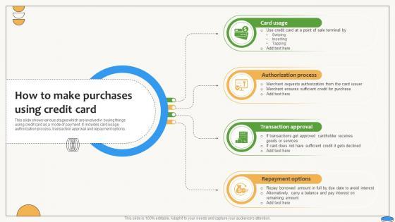 This slide shows various stages which are involved in buying things using credit card as a mode of payment. It includes card usage, authorization process, transaction approval and repayment options. The How To Make Purchases Using Credit Card Swipe Smartly A Practical Guide Fin SS V is a compilation of the most recent design trends as a series of slides. It is suitable for any subject or industry presentation, containing attractive visuals and photo spots for businesses to clearly express their messages. This template contains a variety of slides for the user to input data, such as structures to contrast two elements, bullet points, and slides for written information. Slidegeeks is prepared to create an impression. This slide shows various stages which are involved in buying things using credit card as a mode of payment. It includes card usage, authorization process, transaction approval and repayment options.