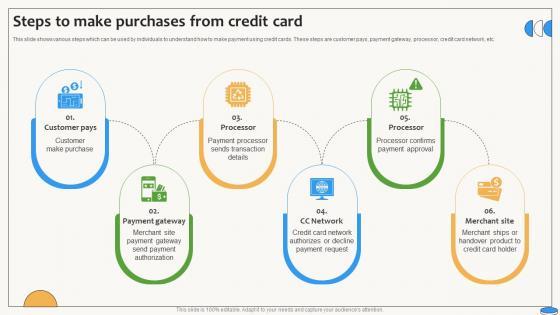 This slide shows various steps which can be used by individuals to understand how to make payment using credit cards. These steps are customer pays, payment gateway, processor, credit card network, etc. Present like a pro with Steps To Make Purchases From Credit Card Swipe Smartly A Practical Guide Fin SS V. Create beautiful presentations together with your team, using our easy-to-use presentation slides. Share your ideas in real-time and make changes on the fly by downloading our templates. So whether you are in the office, on the go, or in a remote location, you can stay in sync with your team and present your ideas with confidence. With Slidegeeks presentation got a whole lot easier. Grab these presentations today. This slide shows various steps which can be used by individuals to understand how to make payment using credit cards. These steps are customer pays, payment gateway, processor, credit card network, etc.
