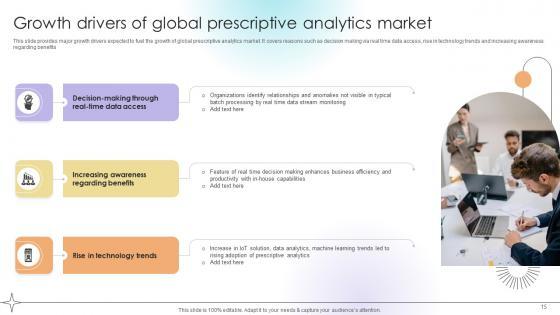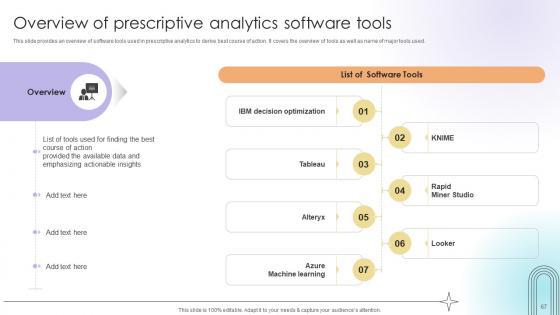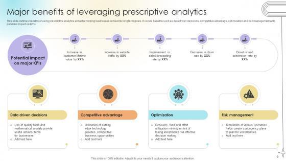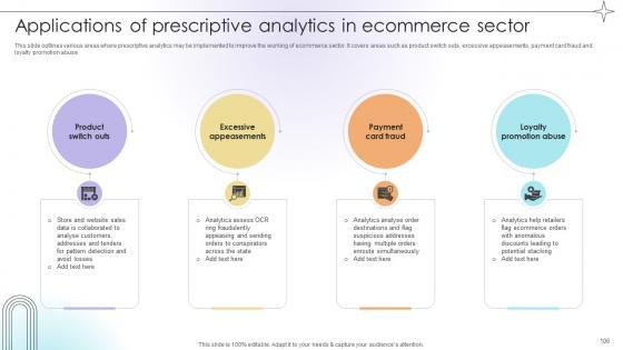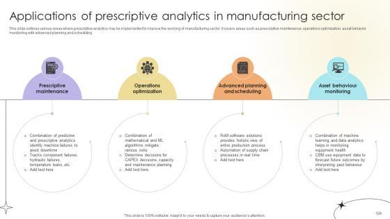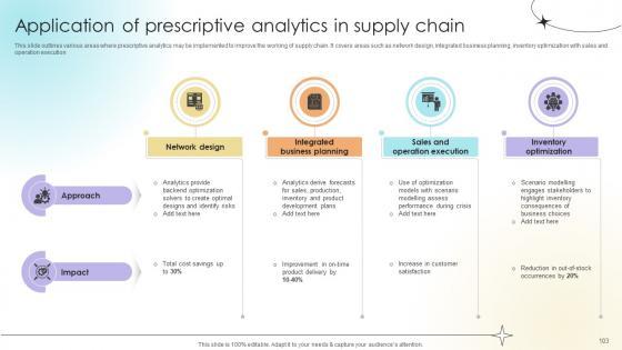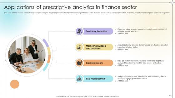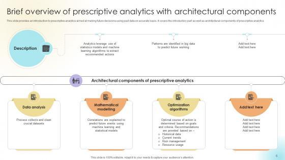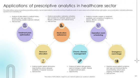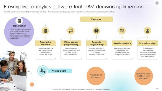 This Optimizing Decision Making The Power Of Prescriptive Analytics Data Analytics CD V is a primer on how to capitalize on business opportunities through planning, innovation, and market intelligence. The content-ready format of the complete deck will make your job as a decision-maker a lot easier. Use this ready-made PowerPoint Template to help you outline an extensive and legible plan to capture markets and grow your company on the right path, at an exponential pace. What is even more amazing is that this presentation is completely editable and 100 percent customizable. This one hunderd eight-slide complete deck helps you impress a roomful of people with your expertise in business and even presentation. Craft such a professional and appealing presentation for that amazing recall value. Download now. Our Optimizing Decision Making The Power Of Prescriptive Analytics Data Analytics CD V are topically designed to provide an attractive backdrop to any subject. Use them to look like a presentation pro.