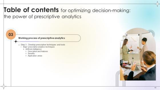 Explore a selection of the finest Table Of Contents For Optimizing Decision Making The Power Of Prescriptive Analytics Data Analytics SS V here. With a plethora of professionally designed and pre-made slide templates, you can quickly and easily find the right one for your upcoming presentation. You can use our Table Of Contents For Optimizing Decision Making The Power Of Prescriptive Analytics Data Analytics SS V to effectively convey your message to a wider audience. Slidegeeks has done a lot of research before preparing these presentation templates. The content can be personalized and the slides are highly editable. Grab templates today from Slidegeeks. Our Table Of Contents For Optimizing Decision Making The Power Of Prescriptive Analytics Data Analytics SS V are topically designed to provide an attractive backdrop to any subject. Use them to look like a presentation pro.