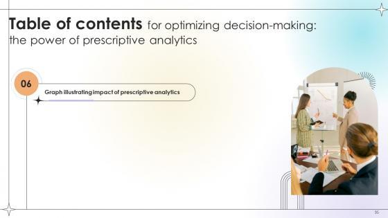 The best PPT templates are a great way to save time, energy, and resources. Slidegeeks have 100 percent editable powerpoint slides making them incredibly versatile. With these quality presentation templates, you can create a captivating and memorable presentation by combining visually appealing slides and effectively communicating your message. Download Table Of Contents Optimizing Decision Making The Power Of Prescriptive Analytics Data Analytics SS V from Slidegeeks and deliver a wonderful presentation. Our Table Of Contents Optimizing Decision Making The Power Of Prescriptive Analytics Data Analytics SS V are topically designed to provide an attractive backdrop to any subject. Use them to look like a presentation pro.