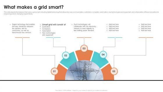 This slide depicts the features that make a grid smart, including digital technology that allows two way communication, controllers, computers, automation, new technologies and equipment, and collaboration of these innovations to respond quickly to changing requirements. Create an editable What Makes A Grid Smart Smart Grid Working that communicates your idea and engages your audience. Whether you are presenting a business or an educational presentation, pre designed presentation templates help save time. What Makes A Grid Smart Smart Grid Working is highly customizable and very easy to edit, covering many different styles from creative to business presentations. Slidegeeks has creative team members who have crafted amazing templates. So, go and get them without any delay. This slide depicts the features that make a grid smart, including digital technology that allows two way communication, controllers, computers, automation, new technologies and equipment, and collaboration of these innovations to respond quickly to changing requirements.