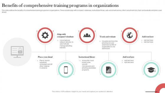 This slide outlines the benefits of comprehensive training programs in organizations. These include align with companys database, instructional library, auto-enrolment service, inform about real risks, track and evaluate and plan a year ahead. Are you in need of a template that can accommodate all of your creative concepts This one is crafted professionally and can be altered to fit any style. Use it with Google Slides or PowerPoint. Include striking photographs, symbols, depictions, and other visuals. Fill, move around, or remove text boxes as desired. Test out color palettes and font mixtures. Edit and save your work, or work with colleagues. Download Benefits Of Comprehensive Training Programs Man In The Middle Phishing IT and observe how to make your presentation outstanding. Give an impeccable presentation to your group and make your presentation unforgettable. This slide outlines the benefits of comprehensive training programs in organizations. These include align with companys database, instructional library, auto-enrolment service, inform about real risks, track and evaluate and plan a year ahead.
