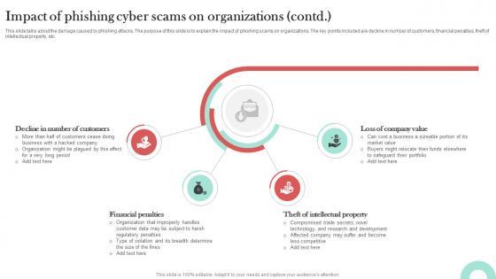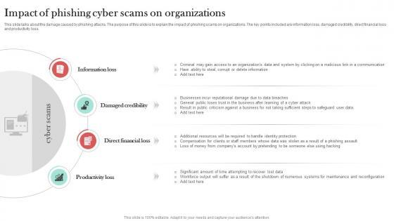 This slide talks about the damage caused by phishing attacks. The purpose of this slide is to explain the impact of phishing scams on organizations. The key points included are information loss, damaged credibility, direct financial loss and productivity loss. Here you can discover an assortment of the finest PowerPoint and Google Slides templates. With these templates, you can create presentations for a variety of purposes while simultaneously providing your audience with an eye-catching visual experience. Download Impact Of Phishing Cyber Scams On Man In The Middle Phishing IT to deliver an impeccable presentation. These templates will make your job of preparing presentations much quicker, yet still, maintain a high level of quality. Slidegeeks has experienced researchers who prepare these templates and write high-quality content for you. Later on, you can personalize the content by editing the Impact Of Phishing Cyber Scams On Man In The Middle Phishing IT. This slide talks about the damage caused by phishing attacks. The purpose of this slide is to explain the impact of phishing scams on organizations. The key points included are information loss, damaged credibility, direct financial loss and productivity loss.