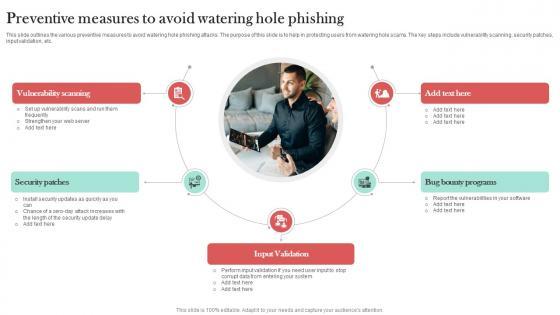 This slide outlines the various preventive measures to avoid watering hole phishing attacks. The purpose of this slide is to help in protecting users from watering hole scams. The key steps include vulnerability scanning, security patches, input validation, etc. Present like a pro with Preventive Measures To Avoid Watering Man In The Middle Phishing IT. Create beautiful presentations together with your team, using our easy-to-use presentation slides. Share your ideas in real-time and make changes on the fly by downloading our templates. So whether you are in the office, on the go, or in a remote location, you can stay in sync with your team and present your ideas with confidence. With Slidegeeks presentation got a whole lot easier. Grab these presentations today. This slide outlines the various preventive measures to avoid watering hole phishing attacks. The purpose of this slide is to help in protecting users from watering hole scams. The key steps include vulnerability scanning, security patches, input validation, etc.