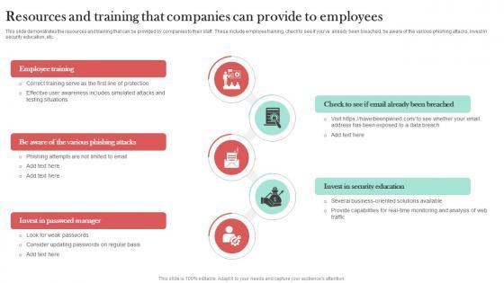 This slide demonstrates the resources and training that can be provided by companies to their staff. These include employee training, check to see if youve already been breached, be aware of the various phishing attacks, invest in security education, etc. Find highly impressive Resources And Training That Companies Man In The Middle Phishing IT on Slidegeeks to deliver a meaningful presentation. You can save an ample amount of time using these presentation templates. No need to worry to prepare everything from scratch because Slidegeeks experts have already done a huge research and work for you. You need to download Resources And Training That Companies Man In The Middle Phishing IT for your upcoming presentation. All the presentation templates are 100 percent editable and you can change the color and personalize the content accordingly. Download now This slide demonstrates the resources and training that can be provided by companies to their staff. These include employee training, check to see if youve already been breached, be aware of the various phishing attacks, invest in security education, etc.