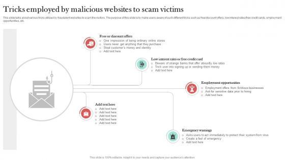 This slide talks about various tricks utilized by fraudulent websites to scam the visitors. The purpose of this slide is to make users aware of such different tricks such as free discount offers, low interest rates free credit cards, employment opportunities, etc. Explore a selection of the finest Tricks Employed By Malicious Websites Man In The Middle Phishing IT here. With a plethora of professionally designed and pre-made slide templates, you can quickly and easily find the right one for your upcoming presentation. You can use our Tricks Employed By Malicious Websites Man In The Middle Phishing IT to effectively convey your message to a wider audience. Slidegeeks has done a lot of research before preparing these presentation templates. The content can be personalized and the slides are highly editable. Grab templates today from Slidegeeks. This slide talks about various tricks utilized by fraudulent websites to scam the visitors. The purpose of this slide is to make users aware of such different tricks such as free discount offers, low interest rates free credit cards, employment opportunities, etc.
