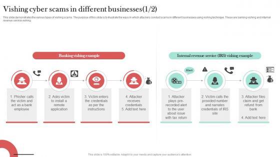 This slide demonstrates the various types of vishing scams. The purpose of this slide is to illustrate the ways in which attackers conduct scams in different businesses using vishing technique. These are banking vishing and internal revenue service vishing. Are you searching for a Vishing Cyber Scams In Different Businesses Man In The Middle Phishing IT that is uncluttered, straightforward, and original Its easy to edit, and you can change the colors to suit your personal or business branding. For a presentation that expresses how much effort you have put in, this template is ideal With all of its features, including tables, diagrams, statistics, and lists, its perfect for a business plan presentation. Make your ideas more appealing with these professional slides. Download Vishing Cyber Scams In Different Businesses Man In The Middle Phishing IT from Slidegeeks today. This slide demonstrates the various types of vishing scams. The purpose of this slide is to illustrate the ways in which attackers conduct scams in different businesses using vishing technique. These are banking vishing and internal revenue service vishing.