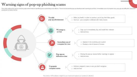 This slide outlines the various warning signs which helps in identifying pop-up phishing cyber attacks. These include terrible pop-up advertisement, warnings to act fast, immediate scan of computer virus, pop-ups are difficult to close and unpopular company names. Retrieve professionally designed Warning Signs Of Pop Up Phishing Scams Man In The Middle Phishing IT to effectively convey your message and captivate your listeners. Save time by selecting pre-made slideshows that are appropriate for various topics, from business to educational purposes. These themes come in many different styles, from creative to corporate, and all of them are easily adjustable and can be edited quickly. Access them as PowerPoint templates or as Google Slides themes. You do not have to go on a hunt for the perfect presentation because Slidegeeks got you covered from everywhere. This slide outlines the various warning signs which helps in identifying pop-up phishing cyber attacks. These include terrible pop-up advertisement, warnings to act fast, immediate scan of computer virus, pop-ups are difficult to close and unpopular company names.