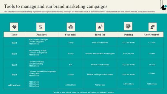 This slide showcases tools that can help organization to manage the brand marketing campaigns and measure the results of promotional activities. Its key elements are tools, features, free trial, pricing and user reviews. Take your projects to the next level with our ultimate collection of Brand Marketing Strategy Tools To Manage And Run Brand Marketing Campaigns Wd Ideas PDF. Slidegeeks has designed a range of layouts that are perfect for representing task or activity duration, keeping track of all your deadlines at a glance. Tailor these designs to your exact needs and give them a truly corporate look with your own brand colors theyll make your projects stand out from the rest.