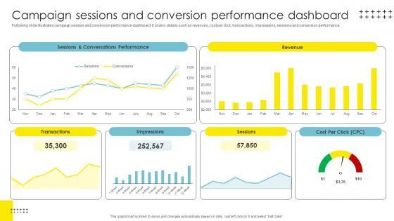 Following slide illustrates campaign session and conversion performance dashboard. It covers details such as revenues, cost per click, transactions, impressions, sessions and conversion performance. Get a simple yet stunning designed Campaign Sessions And Conversion Strategic Brand Management Template Pdf. It is the best one to establish the tone in your meetings. It is an excellent way to make your presentations highly effective. So, download this PPT today from Slidegeeks and see the positive impacts. Our easy to edit Campaign Sessions And Conversion Strategic Brand Management Template Pdf can be your go to option for all upcoming conferences and meetings. So, what are you waiting for Grab this template today. Following slide illustrates campaign session and conversion performance dashboard. It covers details such as revenues, cost per click, transactions, impressions, sessions and conversion performance.