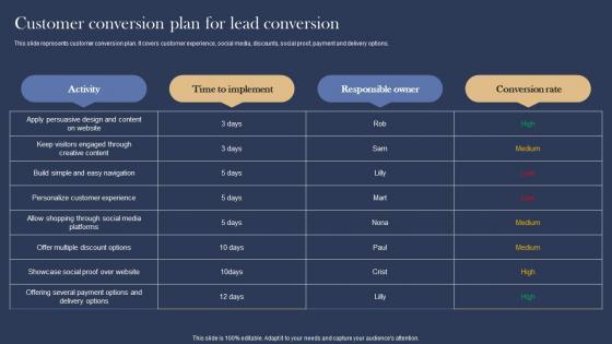 This slide represents customer conversion plan. It covers customer experience, social media, discounts, social proof, payment and delivery options. Formulating a presentation can take up a lot of effort and time, so the content and message should always be the primary focus. The visuals of the PowerPoint can enhance the presenters message, so our Customer Conversion Plan Management And Marketing Strategies For E Commerce Introduction Pdf was created to help save time. Instead of worrying about the design, the presenter can concentrate on the message while our designers work on creating the ideal templates for whatever situation is needed. Slidegeeks has experts for everything from amazing designs to valuable content, we have put everything into Customer Conversion Plan Management And Marketing Strategies For E Commerce Introduction Pdf This slide represents customer conversion plan. It covers customer experience, social media, discounts, social proof, payment and delivery options.