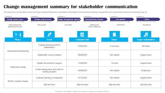 This slide shows communication summary of change management followed in organization to stakeholders. It includes phases of change management such as assessment and planning, implement change, etc. Showcasing this set of slides titled Change Management Summary For Stakeholder Communication Ppt Icon Ideas pdf. The topics addressed in these templates are Estimated Date, Target Stakeholders, Event. All the content presented in this PPT design is completely editable. Download it and make adjustments in color, background, font etc. as per your unique business setting. This slide shows communication summary of change management followed in organization to stakeholders. It includes phases of change management such as assessment and planning, implement change, etc.