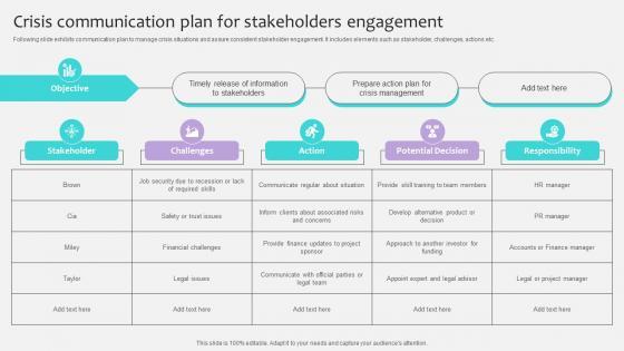 Following slide exhibits communication plan to manage crisis situations and assure consistent stakeholder engagement. It includes elements such as stakeholder, challenges, actions etc. If your project calls for a presentation, then Slidegeeks is your go-to partner because we have professionally designed, easy-to-edit templates that are perfect for any presentation. After downloading, you can easily edit Project Stakeholders Management Crisis Communication Plan For Stakeholders Ppt Powerpoint and make the changes accordingly. You can rearrange slides or fill them with different images. Check out all the handy templates Following slide exhibits communication plan to manage crisis situations and assure consistent stakeholder engagement. It includes elements such as stakeholder, challenges, actions etc.