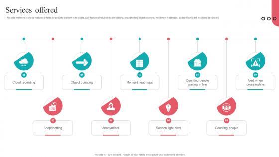 This slide mentions various features offered by security platform to its users. Key features include cloud recording, snapshotting, object counting, movement heatmaps, sudden light alert, counting people etc. Coming up with a presentation necessitates that the majority of the effort goes into the content and the message you intend to convey. The visuals of a PowerPoint presentation can only be effective if it supplements and supports the story that is being told. Keeping this in mind our experts created Services Offered Camera Management Platform Investor Funding Elevator Pitch Deck to reduce the time that goes into designing the presentation. This way, you can concentrate on the message while our designers take care of providing you with the right template for the situation. This slide mentions various features offered by security platform to its users. Key features include cloud recording, snapshotting, object counting, movement heatmaps, sudden light alert, counting people etc.