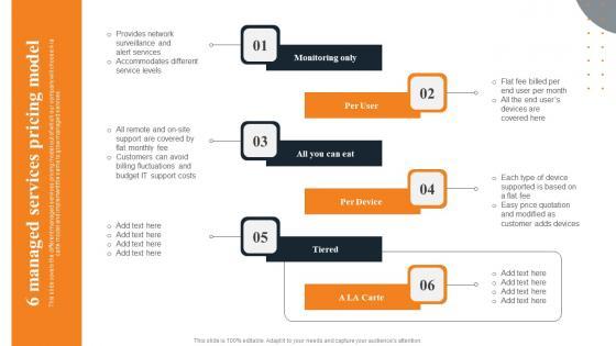 This slide covers the different managed services pricing model out of which our company will choose A la carte model and implement the same to grow managed services. The best PPT templates are a great way to save time, energy, and resources. Slidegeeks have 100 percent editable powerpoint slides making them incredibly versatile. With these quality presentation templates, you can create a captivating and memorable presentation by combining visually appealing slides and effectively communicating your message. Download Individualized Pricing Approach For Managed Services 6 Managed Services Pricing Model Information PDF from Slidegeeks and deliver a wonderful presentation.