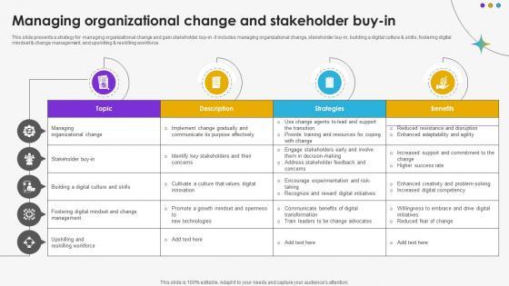 This slide presents a strategy for managing organizational change and gain stakeholder buy-in. it includes managing organizational change, stakeholder buy-in, building a digital culture and skills, fostering digital mindset and change management, and upskilling and reskilling workforce.Crafting an eye-catching presentation has never been more straightforward. Let your presentation shine with this tasteful yet straightforward Managing Organizational Change And Stakeholder Buy In DT SS V template. It offers a minimalistic and classy look that is great for making a statement. The colors have been employed intelligently to add a bit of playfulness while still remaining professional. Construct the ideal Managing Organizational Change And Stakeholder Buy In DT SS V that effortlessly grabs the attention of your audience Begin now and be certain to wow your customers This slide presents a strategy for managing organizational change and gain stakeholder buy-in. it includes managing organizational change, stakeholder buy-in, building a digital culture and skills, fostering digital mindset and change management, and upskilling and reskilling workforce.