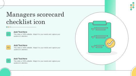 Persuade your audience using this Managers Scorecard Checklist Icon Themes PDF. This PPT design covers three stages, thus making it a great tool to use. It also caters to a variety of topics including Managers, Scorecard, Checklist. Download this PPT design now to present a convincing pitch that not only emphasizes the topic but also showcases your presentation skills.