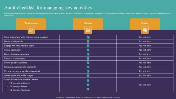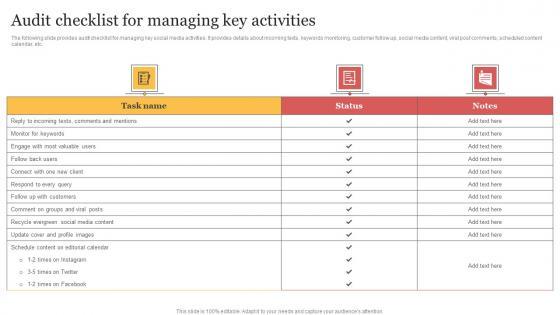 The following slide provides audit checklist for managing key social media activities. It provides details about incoming texts, keywords monitoring, customer follow up, social media content, viral post comments, scheduled content calendar, etc. Want to ace your presentation in front of a live audience Our Audit Checklist For Managing Key Activities Designing Approaches Graphics Pdf can help you do that by engaging all the users towards you. Slidegeeks experts have put their efforts and expertise into creating these impeccable powerpoint presentations so that you can communicate your ideas clearly. Moreover, all the templates are customizable, and easy-to-edit and downloadable. Use these for both personal and commercial use. The following slide provides audit checklist for managing key social media activities. It provides details about incoming texts, keywords monitoring, customer follow up, social media content, viral post comments, scheduled content calendar, etc.