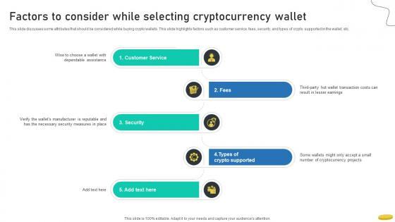 This slide discusses some attributes that should be considered while buying crypto wallets. This slide highlights factors such as customer service, fees, security, and types of crypto supported in the wallet, etc.The Factors To Consider While Selecting Cryptocurrency Wallet Cryptocurrency Management With Blockchain is a compilation of the most recent design trends as a series of slides. It is suitable for any subject or industry presentation, containing attractive visuals and photo spots for businesses to clearly express their messages. This template contains a variety of slides for the user to input data, such as structures to contrast two elements, bullet points, and slides for written information. Slidegeeks is prepared to create an impression. This slide discusses some attributes that should be considered while buying crypto wallets. This slide highlights factors such as customer service, fees, security, and types of crypto supported in the wallet, etc.