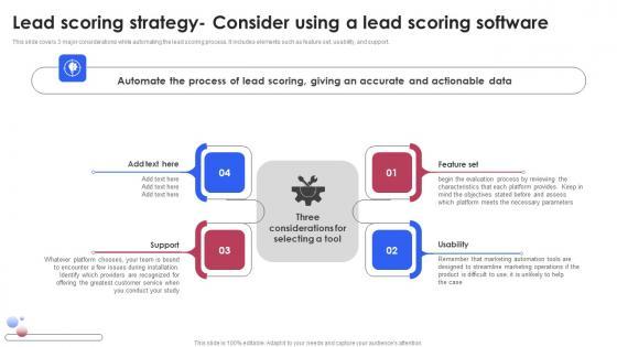 This slide covers 3 major considerations while automating the lead scoring process. It includes elements such as feature set, usability, and support. From laying roadmaps to briefing everything in detail, our templates are perfect for you. You can set the stage with your presentation slides. All you have to do is download these easy-to-edit and customizable templates. Lead Scoring Strategy Consider Using A Lead Scoring Various Techniques For Managing Guidelines PDF will help you deliver an outstanding performance that everyone would remember and praise you for. Do download this presentation today. This slide covers 3 major considerations while automating the lead scoring process. It includes elements such as feature set, usability, and support.