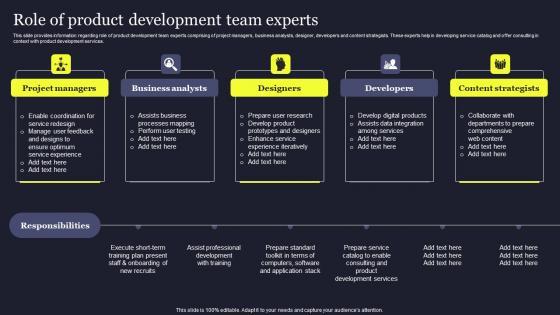 This slide provides information regarding role of product development team experts comprising of project managers, business analysts, designer, developers and content strategists. These experts help in developing service catalog and offer consulting in context with product development services. Take your projects to the next level with our ultimate collection of Role Of Product Development Team Experts Playbook For Managing Us Structure Pdf. Slidegeeks has designed a range of layouts that are perfect for representing task or activity duration, keeping track of all your deadlines at a glance. Tailor these designs to your exact needs and give them a truly corporate look with your own brand colors they all make your projects stand out from the rest. This slide provides information regarding role of product development team experts comprising of project managers, business analysts, designer, developers and content strategists. These experts help in developing service catalog and offer consulting in context with product development services.