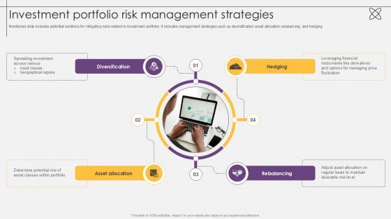 Mentioned slide includes potential solutions for mitigating risks related to investment portfolio.It includes management strategies such as diversification asset allocation rebalancing, and hedging. Presenting this PowerPoint presentation, titled Investment Portfolio Risk Management Strategies Investment Fund PPT Template, with topics curated by our researchers after extensive research. This editable presentation is available for immediate download and provides attractive features when used. Download now and captivate your audience. Presenting this Investment Portfolio Risk Management Strategies Investment Fund PPT Template. Our researchers have carefully researched and created these slides with all aspects taken into consideration. This is a completely customizable Investment Portfolio Risk Management Strategies Investment Fund PPT Template that is available for immediate downloading. Download now and make an impact on your audience. Highlight the attractive features available with our PPTs. Mentioned slide includes potential solutions for mitigating risks related to investment portfolio.It includes management strategies such as diversification asset allocation rebalancing, and hedging.