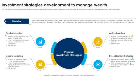 This slide shows various strategies which can be used by wealth management personnels to invest clients money into various assets or securities. These strategies are passive investing, active investing, etc. Formulating a presentation can take up a lot of effort and time, so the content and message should always be the primary focus. The visuals of the PowerPoint can enhance the presenters message, so our Investment Strategies Development To Strategic Wealth Management And Financial Fin SS V was created to help save time. Instead of worrying about the design, the presenter can concentrate on the message while our designers work on creating the ideal templates for whatever situation is needed. Slidegeeks has experts for everything from amazing designs to valuable content, we have put everything into Investment Strategies Development To Strategic Wealth Management And Financial Fin SS V. This slide shows various strategies which can be used by wealth management personnels to invest clients money into various assets or securities. These strategies are passive investing, active investing, etc.