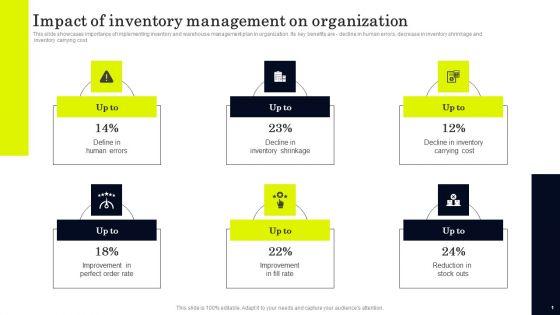 This slide showcases importance of implementing inventory and warehouse management plan in organization. Its key benefits are decline in human errors, decrease in inventory shrinkage and inventory carrying cost. Formulating a presentation can take up a lot of effort and time, so the content and message should always be the primary focus. The visuals of the PowerPoint can enhance the presenters message, so our Impact Of Inventory Management On Organization Sample PDF was created to help save time. Instead of worrying about the design, the presenter can concentrate on the message while our designers work on creating the ideal templates for whatever situation is needed. Slidegeeks has experts for everything from amazing designs to valuable content, we have put everything into Impact Of Inventory Management On Organization Sample PDF.