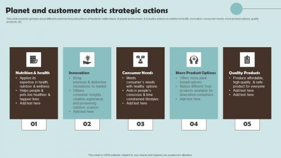 This slide provides glimpse about different customer focused actions of Nestle for better future of planet and humans. It includes actions on nutrition and health, innovation, consumer needs, more product options, quality products, etc.This Planet And Customer Centric Strategic Actions Outline Of Nestle Management Slides Pdf from Slidegeeks makes it easy to present information on your topic with precision. It provides customization options, so you can make changes to the colors, design, graphics, or any other component to create a unique layout. It is also available for immediate download, so you can begin using it right away. Slidegeeks has done good research to ensure that you have everything you need to make your presentation stand out. Make a name out there for a brilliant performance. This slide provides glimpse about different customer focused actions of Nestle for better future of planet and humans. It includes actions on nutrition And health, innovation, consumer needs, more product options, quality products, etc.