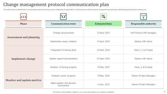 Showcasing this set of slides titled Change Management Protocol Communication Plan Ppt Inspiration Skills Pdf. The topics addressed in these templates are Communication Event, Estimated Data, Responsible Authority. All the content presented in this PPT design is completely editable. Download it and make adjustments in color, background, font etc. as per your unique business setting. This slide shows comprehensive communication plan for informing various employees of organization. It include various sections such as assessment and planning, implementing change with monitoring, etc.