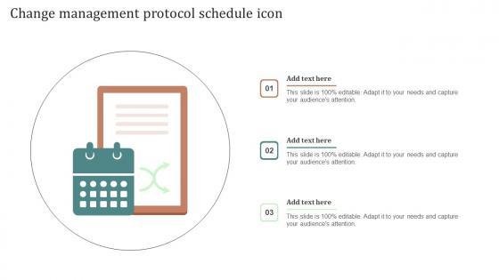 Pitch your topic with ease and precision using this Change Management Protocol Schedule Icon Ppt Professional Pictures Pdf. This layout presents information on Change Management, Protocol Schedule, Icon. It is also available for immediate download and adjustment. So, changes can be made in the color, design, graphics or any other component to create a unique layout. Our Change Management Protocol Schedule Icon Ppt Professional Pictures Pdf are topically designed to provide an attractive backdrop to any subject. Use them to look like a presentation pro.